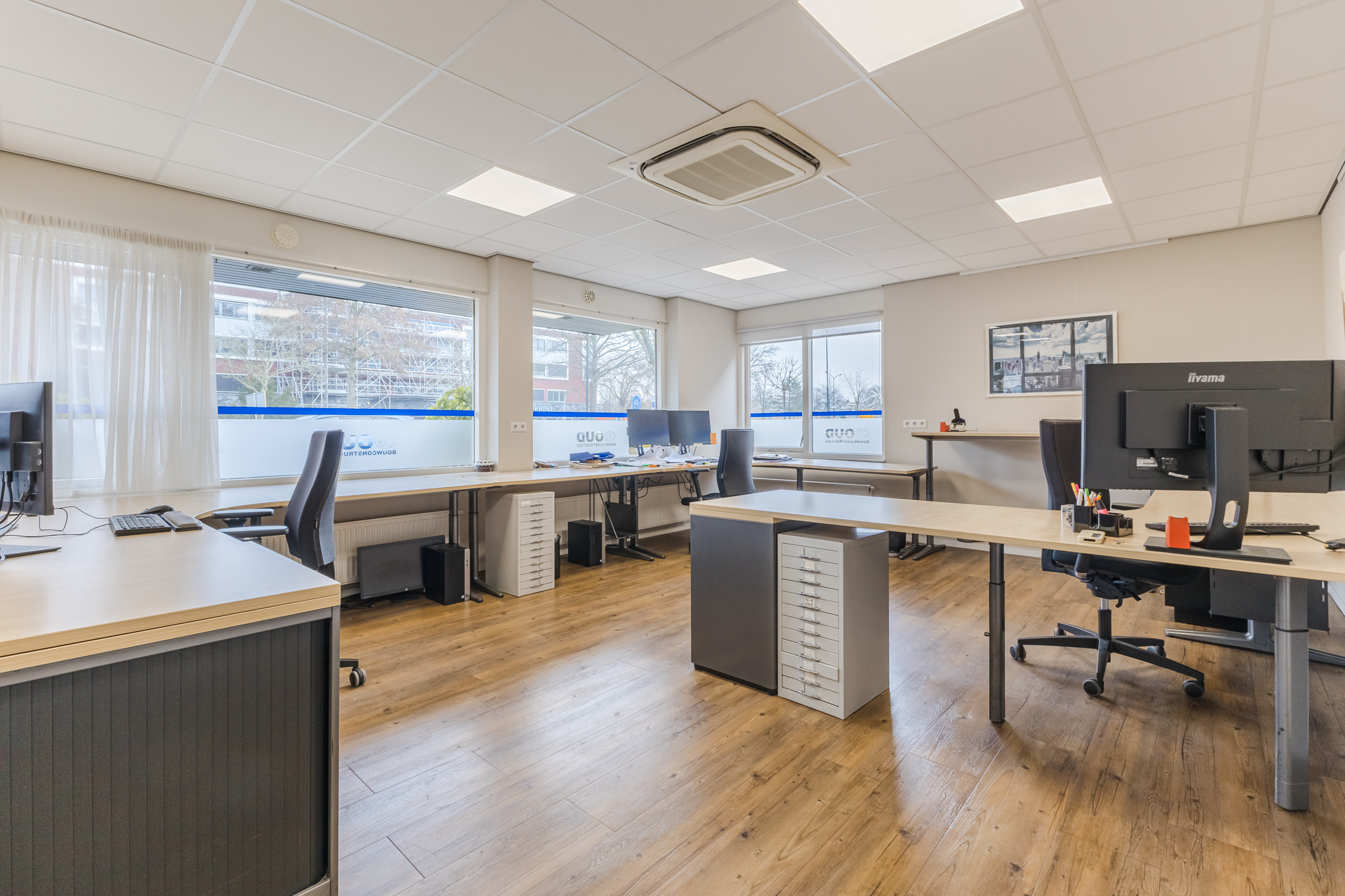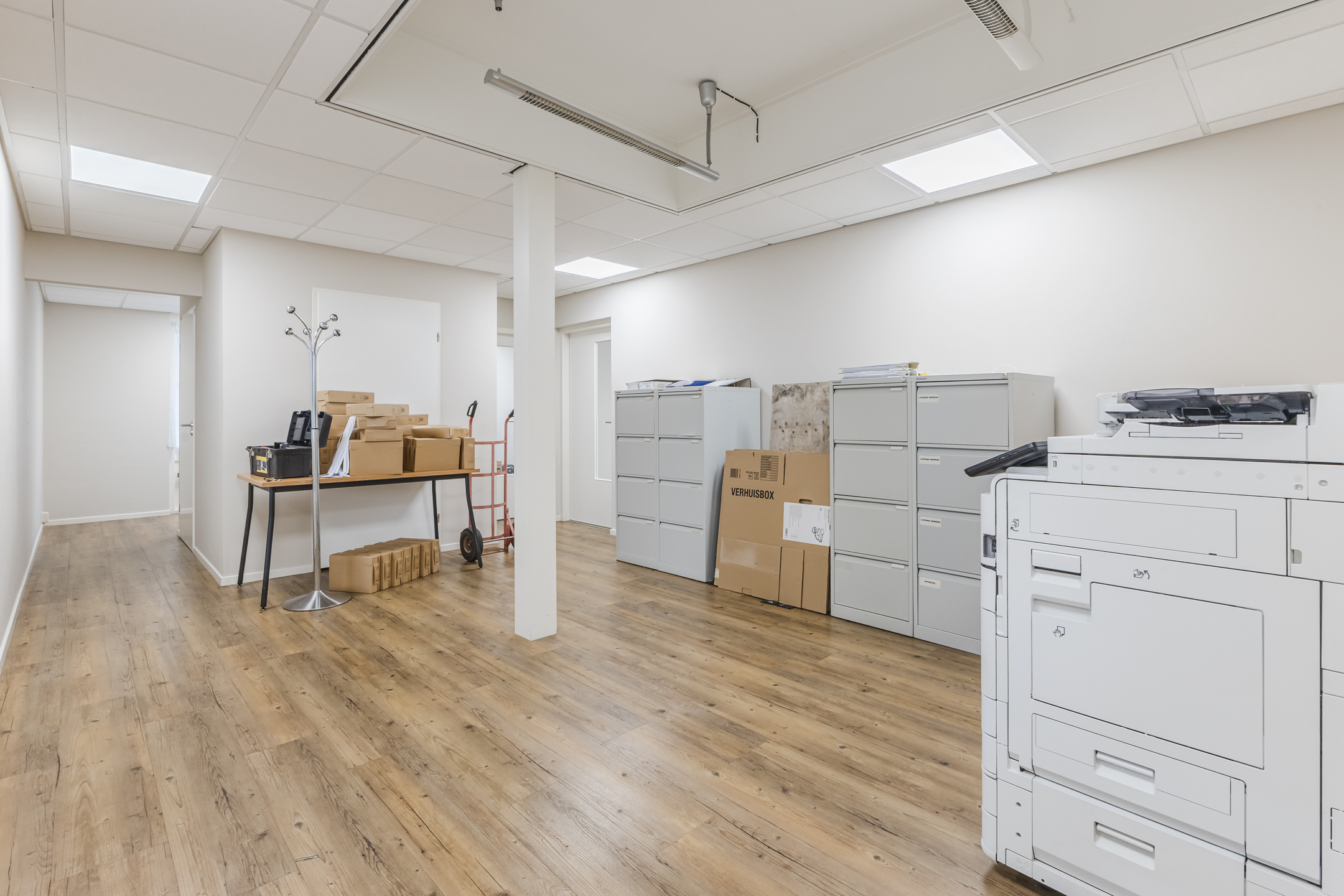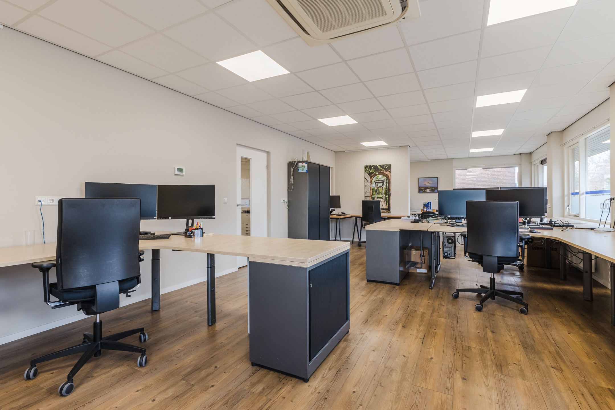 Het betreft de volledige begane grond, welke een lichte uitstraling heeft door de nette vloerafwerking en vele raampartijen rondom. De begane grond beschikt over een representatieve entree, 3 kantoorruimtes, een opslag-/archiefruimte, hal, pantry en modern toilet.