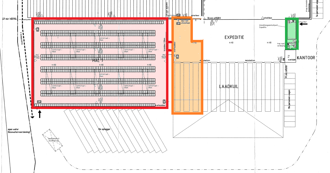 Op bedrijventerrein De Braken biedt VLIEG Bedrijfsmakelaars deze prachtige (logistieke) bedrijfsruimte aan bestaande uit een bedrijfshal van ca. 2.480 m² (rode kleur op tekening), voorzien van stellingen (max. 2.500 palletplaatsen) alsmede ca. 375 m2 bedrijfsruimte/ expeditie (oranje kleur op tekening) direct aangrenzend aan de expeditie van een andere huurder. Daarnaast is er een kantine en toiletvoorziening (totaal groot ca. 100 m2) op basis van gemeenschappelijk gebruik (groene kleur op tekening). Het object kent een vrije hoogte van circa 10,9 meter en beschikt over drie loadingdocks voorzien van levelers en één maaiveld-overheaddeur. Op eigen terrein zijn voldoende parkeerplaatsen beschikbaar, in overleg uit te breiden met (beperkte) buitenopslag.